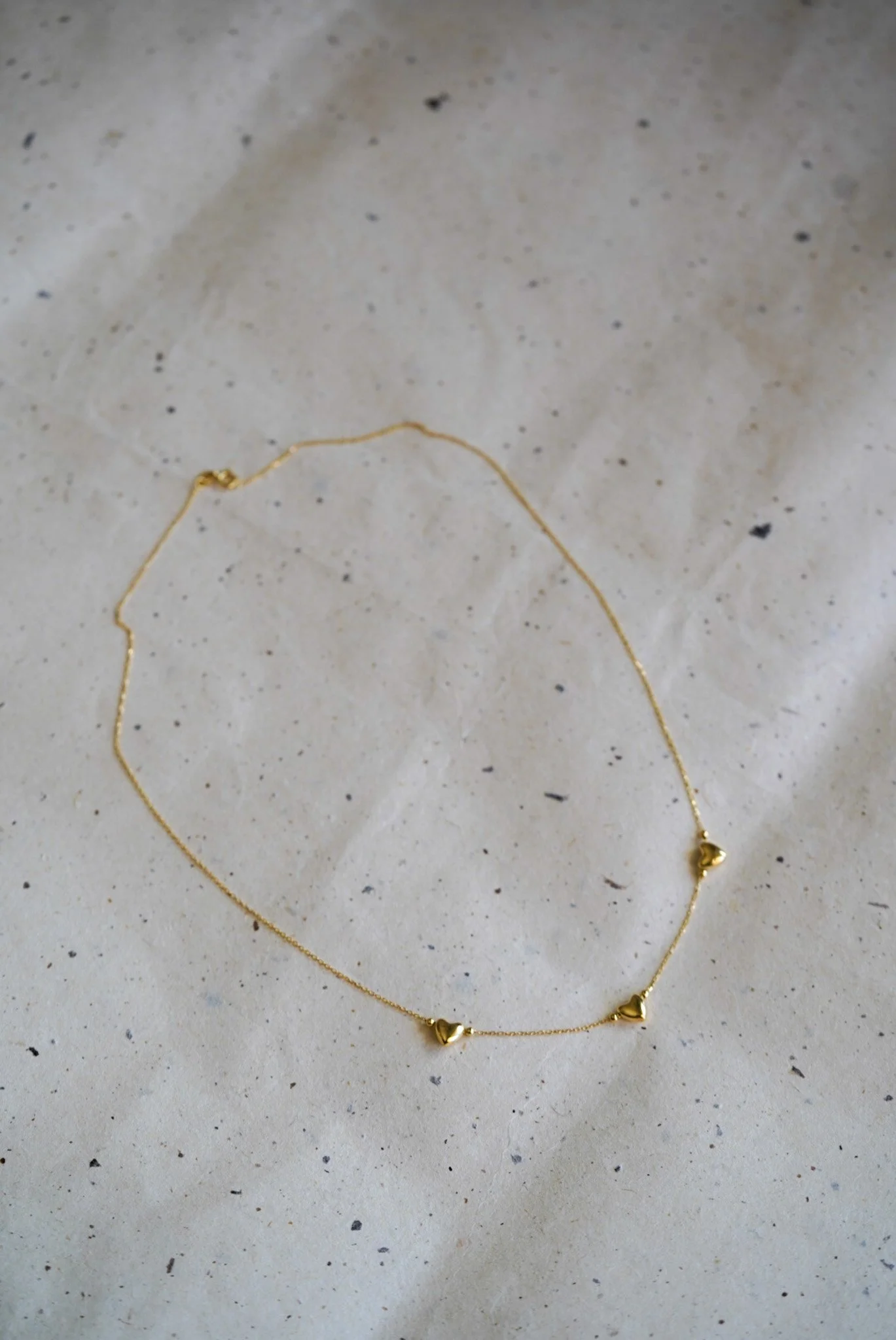 The ‘Valentino’ heart chain crafted in solid 9ct yellow gold. ‘Valentino features three little heart charms fixed onto a fine cable chain. It’s cute, it’s sexy, maybe even a little badass if you want it to be, it’s perfect for layering or to stand alone as the GORG feature piece it can be in all it’s soft and delicate beauty.